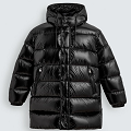 Áo khoác dáng dài chần bông làm từ vải kỹ thuật có độ bóng. Bên trong nhồi hỗn hợp 80% lông tơ và 20% lông vũ. Cổ cao có chi tiết mũ trùm đầu có thể tháo rời và tay dài bo chun ở cổ tay. Túi may viền ở hông và một túi